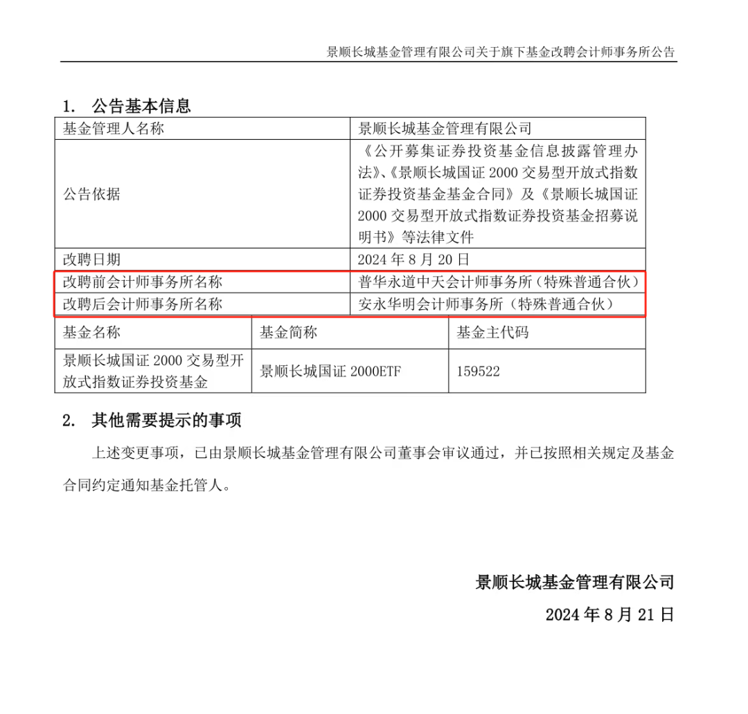 八月二十一日,景顺长城基金发布了一份关于其基金改聘会计师事务所的公告。根据公告,从8月20日起,景顺长城国证2000ETF会计师事务所由普华永道中天会计师事务所(特殊普通合伙)调整为安永华明会计师事务所(特殊普通合伙)。上述变更事项,已由景顺长城基金董事会审议通过,并已按有关规定和基金合同规定通知基金托管人。