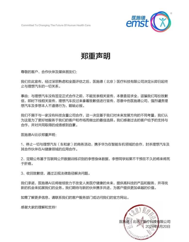 该声明提到,经过深思熟虑和全面评估,医施德(北京)医疗科技有限公司决定从现在开始终止与理想汽车的一切关系。然而,这份网络爆炸声明于8月19日发布,但签名日期显示为8月20日。