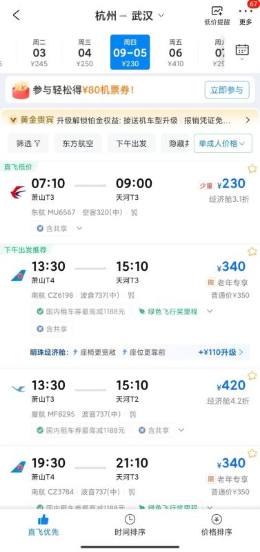 小布在旅游App上搜索机票价格,发现杭州8月底至9月初出发的机票价格普遍较8月初明显下降,杭州至武汉至珠海的机票甚至只有200多张。根据携程店铺的数据,8月中下旬进入旅游淡季,旅游团价格明显低于暑假,特价团价格便宜了近三分之二。