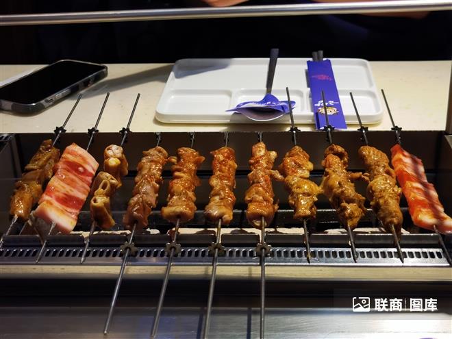 在饮食方面,这些摊位烧烤店也有统一的标准化流程。顾客进店后,先找桌子,然后在自选区用购物篮选串。从烧烤食材,到烧烤用具,再到饮料和甜点,每个产品都有标签。挑选后,扫描代码,为店员计算价格。结账后,坐下,卷起袖子烤,边烤边吃。