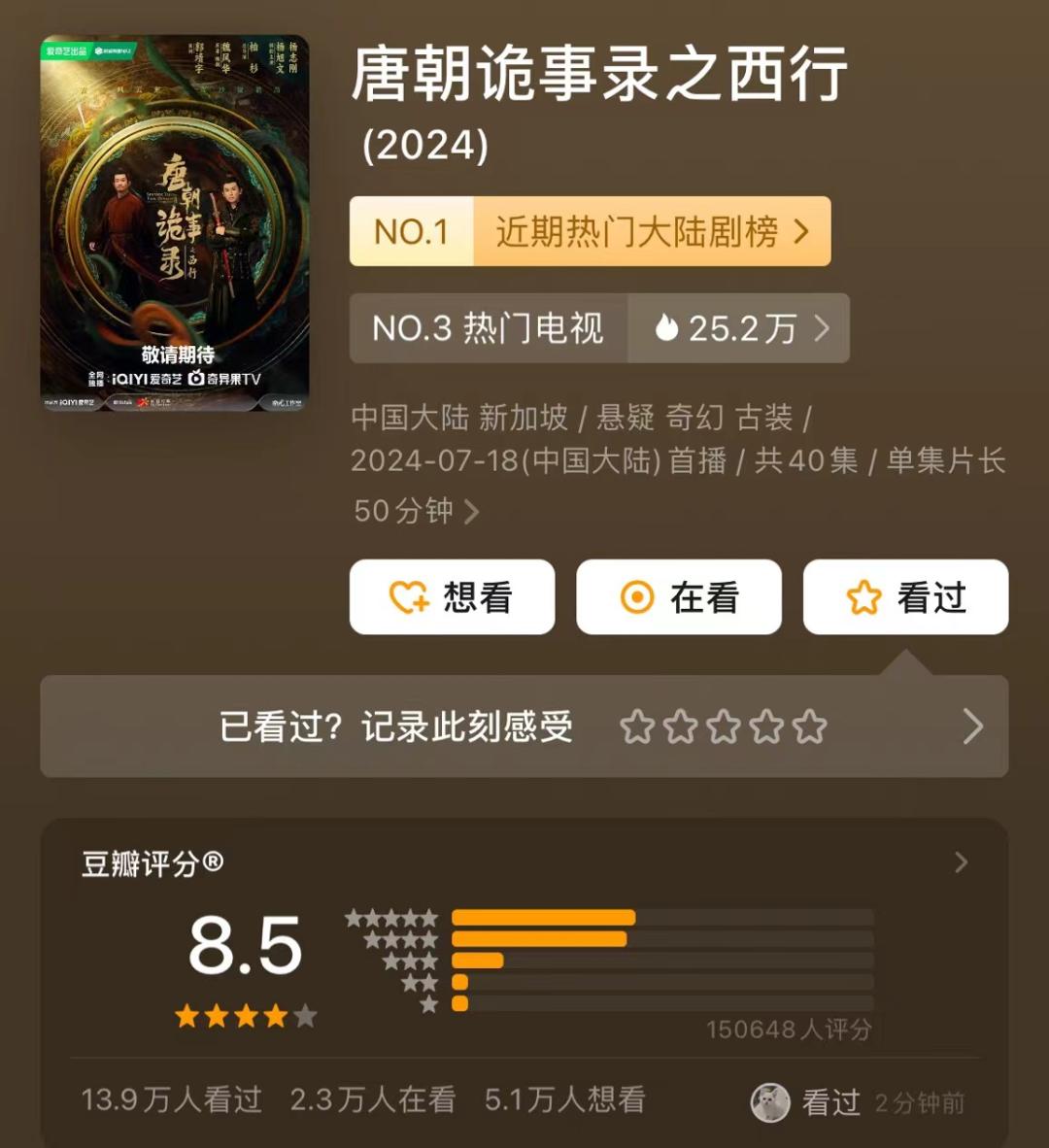 《唐朝诡事录西行》可以在此期间稳定市场,这与它在奥运会前播出,并以“死亡”等案件迅速获得稳定的声誉,完成忠实观众的加速进入有关。截至目前,该剧在豆瓣上评分8.5分,评分人数15万。 。
