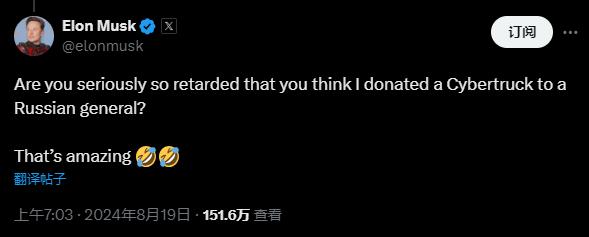 卡德罗夫最后邀请马斯克参观车臣,因为卡德罗夫是俄罗斯总统普京的长期盟友,这导致马斯克在社交平台上受到伤害。马斯克强烈反击这一点。“你真傻到以为我送了一辆车。 Cybertruck 给予俄罗斯将军吗?”