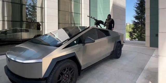 上个星期,俄罗斯车臣共和国领导人拉姆称赞 · 在社交平台上,卡德罗夫发布了一段视频,视频中他展示了一辆电动皮卡,顶部配有机枪。 Cybertruck,他自己站在机枪后面。