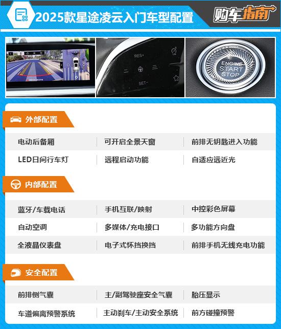 2025 款星途凌云于 7 月 18 每天正式上市,售价区间 12.99-16.99 万元。同时,官方还推出了多项购车福利,包括从现在开始到现在。 8 月 31 日期买车的顾客可以享受 2000 元订金抵 10000 元车款(1.6T 除了王者版本),2.0T 款式限时免费选择价值。 5000 沐光橙豪华内饰块(NAPPA 真皮座椅 购买汽车的权益,如云绒感麂皮天花板。与此同时,更换购买客户享受 6000 元购车补贴,符合我国“新旧置换”政策的车辆,除享受外, 7000 除了元国补,星途还有额外的补贴。 5000 元。另外,第一位车主还可以享受全车终身保修、终身免费基础流量、三年免费娱乐流量(10G/ 月)、终身免费道路救援等专属福利(详情请咨询当地经销商)。