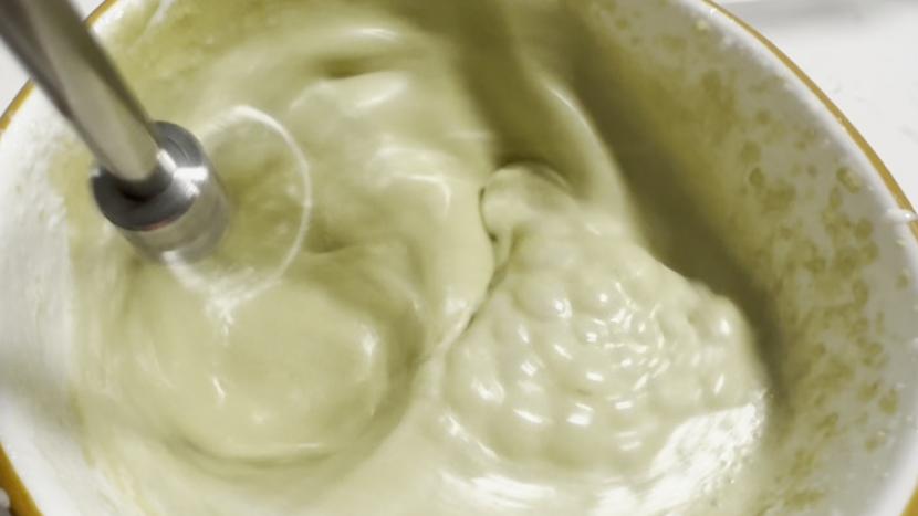 加入准备好的抹茶奶,消磨均匀后倒入器皿,放入冰箱冷冻。