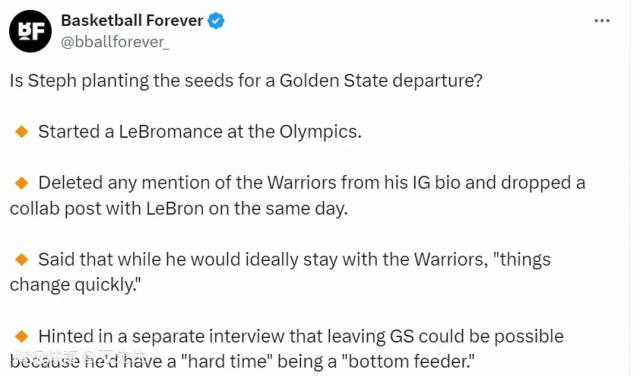 库里在个人社交媒体上 Instagram 在个人介绍中删除了任何与勇士有关的内容,并在同一天与詹姆斯发布了合作帖子。