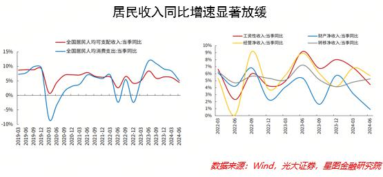 消费者表现不佳,自然是收益端出了问题。从实际情况来看,人均收入下降也是不争的事实:今年第二季度,全国人均可支配收入同比增长。 4.5%,明显低于第一季度 6.2%;而且从人均收入细分类型来看,今年第二季度工资收入、财产净收入、经营净收入同比增速均低于第一季度。考虑到收益是消费的基础和前提,收益的下降自然会不可避免地抑制消费的增长。