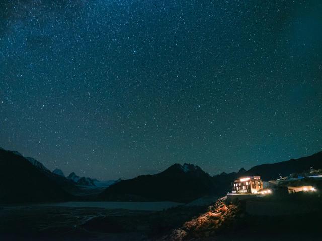 这个酒店的位置特别独特,建在雪山脚下一个只有五户人家的小村庄里,几乎是五户人家,被雪山、林海、牧场包围,。所以这个地方,你说有什么光污染?