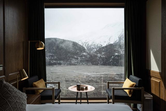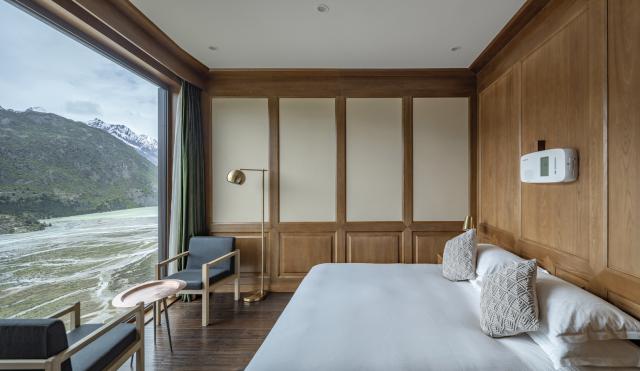 给大家看看古山居的房间,大面落地窗直面冰川,你说国内哪家酒店可以。