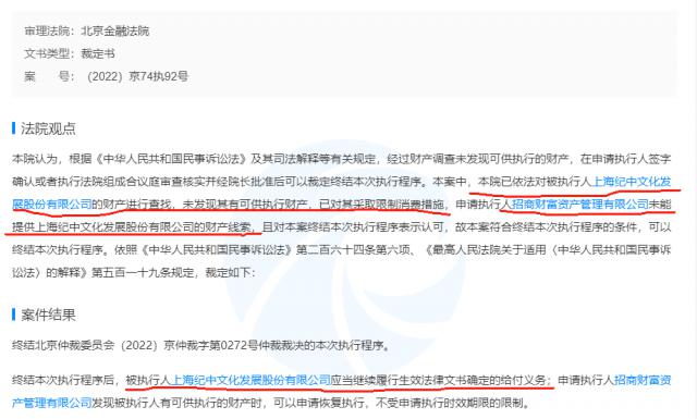但是时代周报发现,2022 年 6 月份,北京金融法院公布了判决文件,投资财富要求冻结纪中文化 7492.69 万元资产。在纪中影视基金核对招商财富。 8100 根据最终要求的万元认缴金额和冻结金额,招商财富认缴的巨额资金投入经历了近距离 8 年时间,到 2022 每年的时间,或者出现撤离困难。根据法院的执行裁定文件,法院除了冻结纪中文化持有的股份外,还扣除了1000多元现金,没有发现纪中文化还有其他资产可以执行。