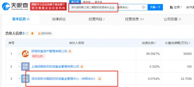 上海招商银行股权投资基金管理有限公司(上海招商银行、招商财富子公司)占比 0.332% 合伙份额,