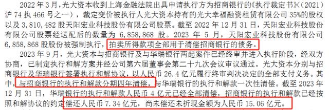 根据光大证券的通知,光大资本与招商银行达成和解,调解的总对价是 22.4 1亿元,分四年偿还,其中 2023 2000年,光大资本已向招商银行偿还。 7.34 亿元,还有 15.06 1亿元未偿还。另外,招商银行在 2023 2008年,光大资本也通过法院拍卖持有。 685.88 天阳宏业股票万股。