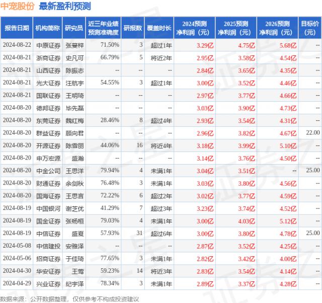 根据证券之星数据中心近三年发布的研究报告数据,中金公司王思洋研究员团队对该股进行了深入研究,近三年的预测准确度均值为 预测79.94% 2024 年度归属净利润为利润 3.04 十亿,根据现价转换预测。 PE 为 19.46。