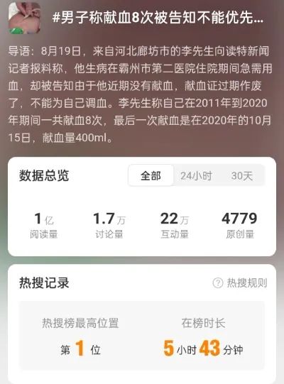 8月22日,#该男子表示,8次献血被告知不能优先使用血#在微博热搜中排名第一。然而,仔细看,患者、医院和血站的说法是不同的。当地主管机构对此有何回应?