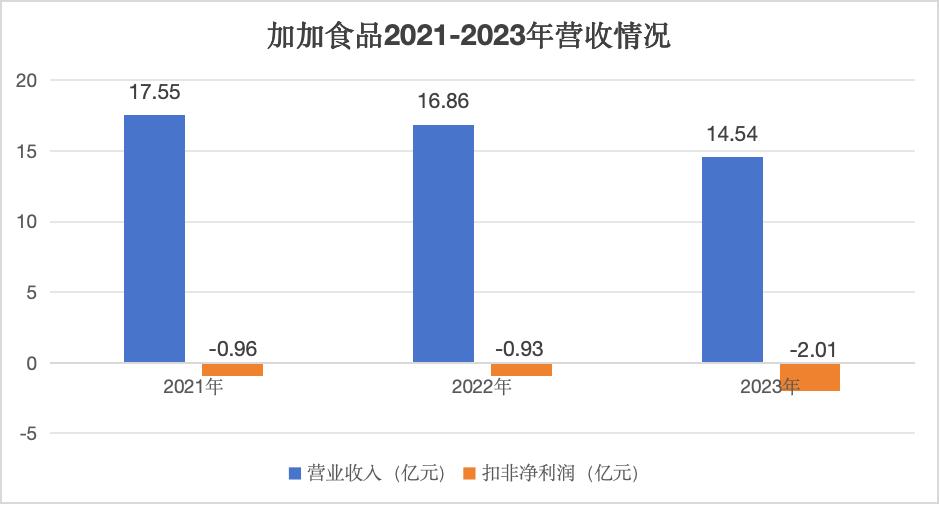 自2021年以来,加加食品的营业收入和净利润连续三年呈下降趋势。从2021年到2023年,其营收从17.55亿元下降到14.54亿元,扣除的非净利润从0.96亿元扩大到2.01亿元。