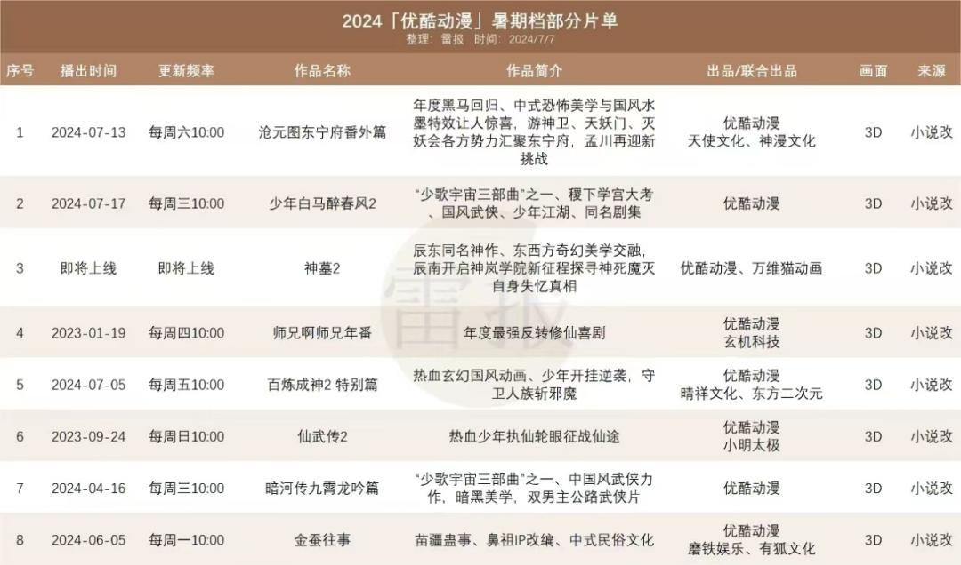 今夏,优酷还发布了一份暑期档片单,其中汇集了优酷动画的各大头部IP作品,而且基本上都是由优酷动画制作。比如国漫《黑马》《沧元图》续集《沧元图东宁府外文》,去年国庆档诞生,优酷动漫王牌IP之一《少歌宇宙》第二季《少年歌行》父母的故事,以及改编自起点白金作家辰东同名代表作《神墓》第二季。
