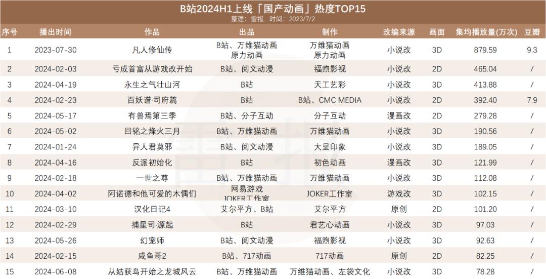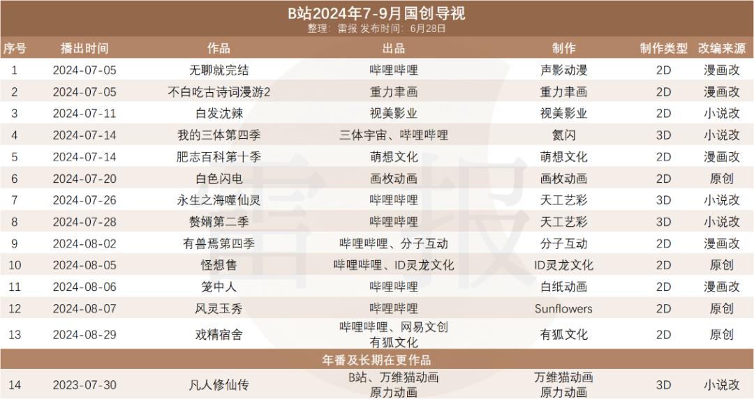 6月28日,哔哩哔哩发布了今年7-9月的国创导视,7-8月播出了包括《凡人修仙传》在内的14部作品,9月份暂时没有作品的官方宣布。其中,除了《凡人修仙传》、《我的三体第四季》、永生之海噬仙灵、著名的IP续作《有兽焉第四季》表现不错,新动画作品整体表现一般。
