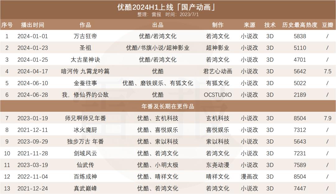 动画方面,上半年优酷共播出13部作品,全部参与制作,包括6部新作、7部年度作品和7部长期作品。从制作公司的角度来看,如果鸿文化承载的作品最多有4部,而其他公司则各制作一部,包括众所周知的玄机科技、无敌影业、君艺心动画、快乐娱乐、索以科技等等。