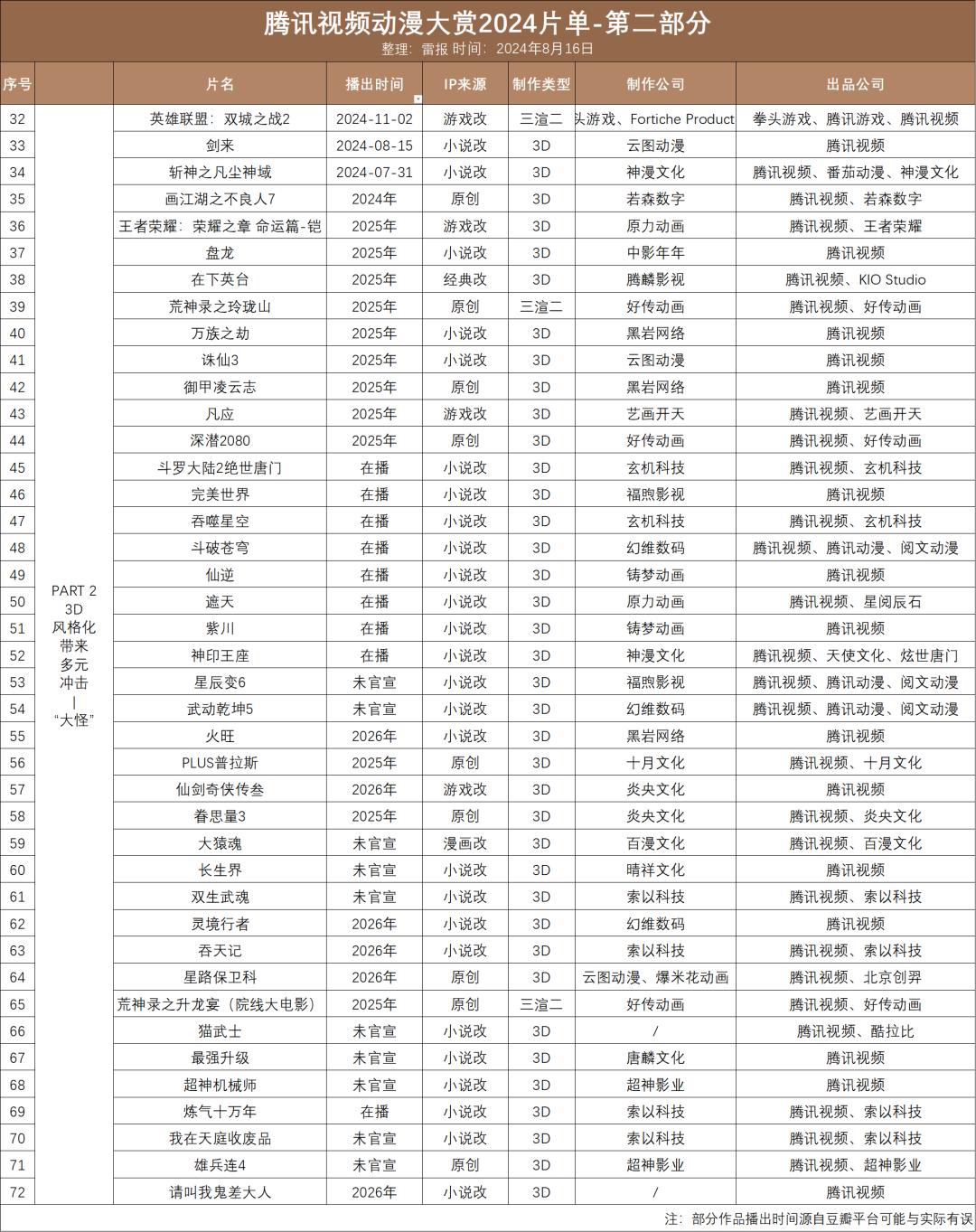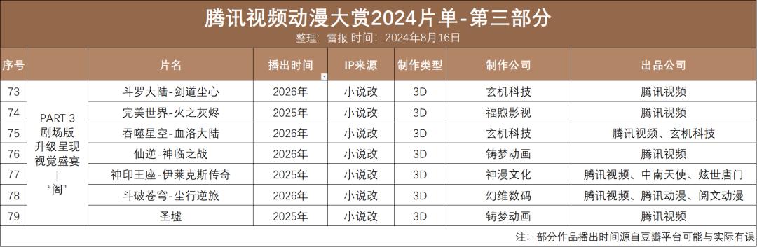 在8月份举行的“2024腾讯视频动画奖”中,腾讯还发布了涉及60年的“气”、“怪”、“阁”三大主题。 79部IP动画新作。