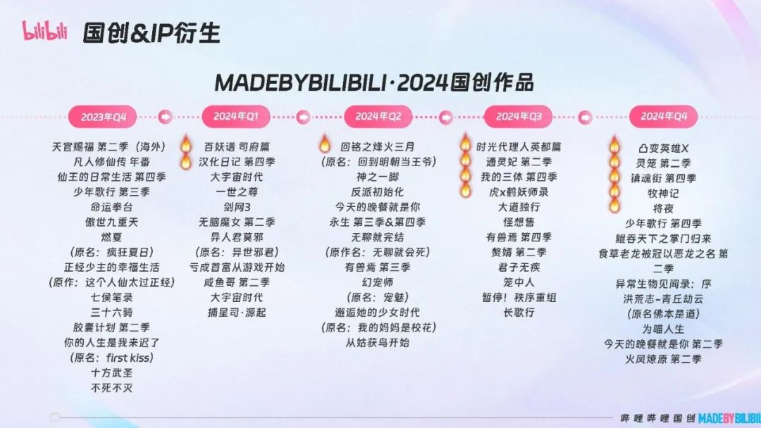 截至发稿日,今年哔哩哔哩国创地区的表现实在令人不满。从《2024英里内容营销通案》发布的国创发布计划可以看出,今年哔哩哔哩国创区预计将在第三季度和第四季度保留相关作品,包括热门IP续集《时间代理人》 英都篇》、《灵笼第二季》、《镇魂街第四季》、《少年歌行第四季》;长时间的预热,PV备受好评的《凸变英雄X》;改编自同名漫画的哔哩哩漫画,幻维数码制作的《虎x鹤妖师录》;《将夜》由猫腻同名小说改编,万维猫动画制作。;《牧神记》由宅猪同名小说改编,玄机科技制作,但目前还没有关于内容的定档消息。