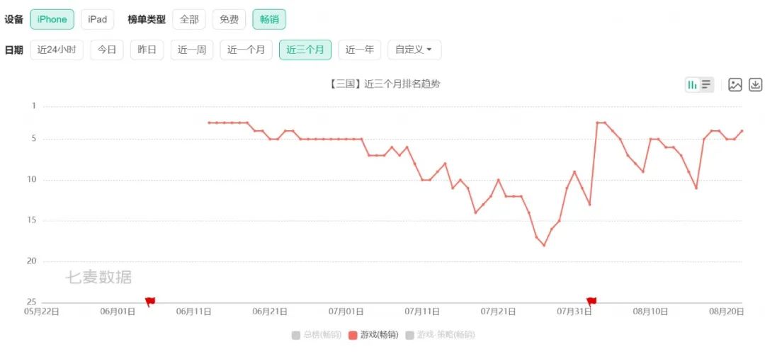 自《三国:谋定天下》上线以来,游戏畅销榜的排名状况