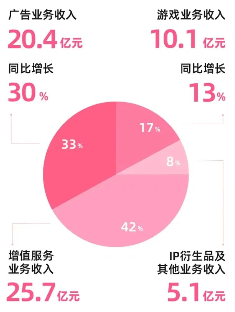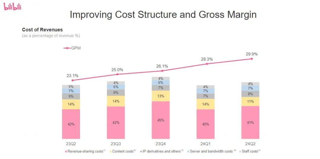 在这些服务中,“增值服务”(包括大会员、直播等)Q2已达到25.7亿元,占季度总收入的42%,较2023年同期增长11%,主要是由于高级会员、直播等增值服务支付用户数量的增加;广告业务收入为20.4亿元,同比增长30%,主要是因为公司广告产品的供应和广告效率的提高;游戏业务收入为人民币10.1亿元,同比增长13%,主要是因为公司推出了新的独家授权游戏《三国:为世界做决定》;IP衍生品等业务收入为5.1亿元,同比下降4%。