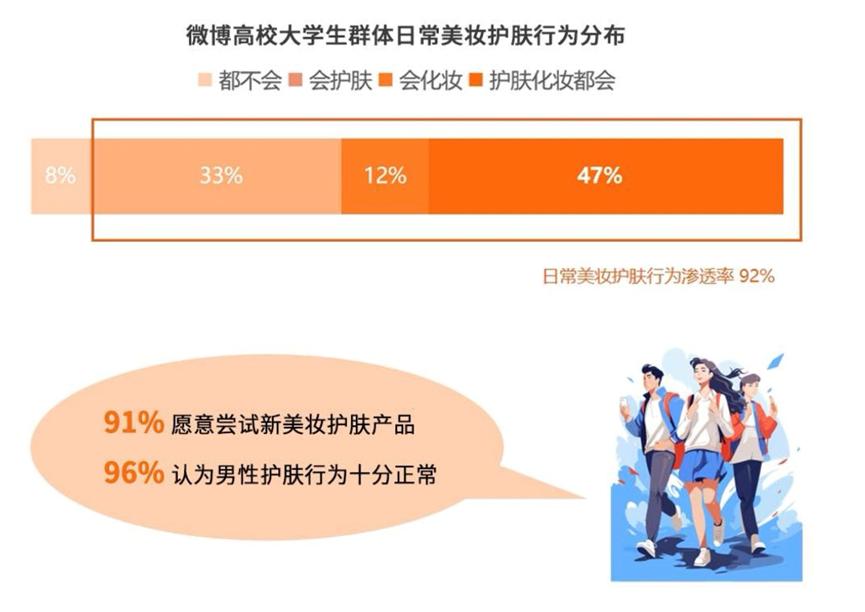 通过微博网站对大学生的调查,发现美容护肤行为逐渐融入大学生的日常生活,日常美容行为渗透率高达92%,近一半的学生有美容护肤的习惯。此外,91%的学生在医院尝试新的美容护肤产品,男性护肤行为的认可度也提高到96%。