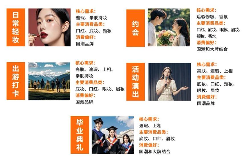 当代大学生对约会、旅游、活动庆典等场景更加频繁,化妆品消费品类也变得更加普遍。他们关注的焦点是能否满足个性化妆和拍照打卡的需求。化妆品消费逐渐向国潮大品牌倾斜,眼妆、底妆、口红跃居前三大类。