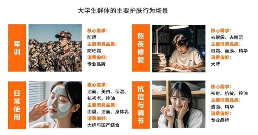随着护肤美容接受度的提高,大学生对护肤场景的需求也逐渐多样化。护肤需求大多集中在日常抗衰老修复上,整体消费偏好对商品品牌有一定的要求。