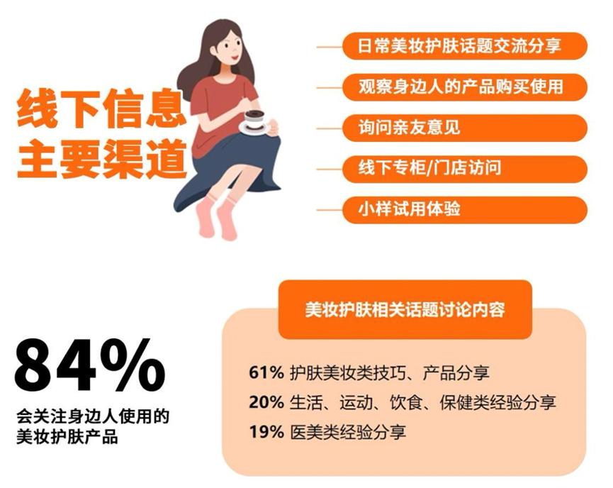 大学生线下获取美容护肤品信息的主要渠道是亲朋好友的交流分享,室友和同学亲眼可见使用效果和产品购买经验是不可多得的参考来源。据统计,84%的人会关注周围人使用的美容护肤品,61%的人会讨论美容技巧,分享商品。
