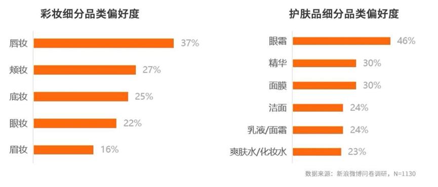 口红凭借其超高的性价比和高度的自我满足体验,成功成为大学生的新宠。37%的大学生喜欢口红产品,其次是脸颊妆和底妆。眼霜、精华、面膜依次获得护肤品前三名。
