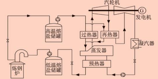 一般而言,用户的用电量随着时间的推移而变化。与此同时,电能不能大规模储存,为保证电网供电稳定,需要用户需要多少电,电厂就会发多少电。但是要发多少电厂才能发多少电只是理想的状态。机组负荷过低会导致不稳定,机组频繁启停会造成经济损失等问题,难以保证电网供电的稳定性,因此采用高温熔盐储能技术。高温熔盐储能技术可以保存锅炉产生的过多蒸汽的热量,然后根据电网的需要将储存的热量返回汽轮机组发电,从而实现机组的灵活运行。