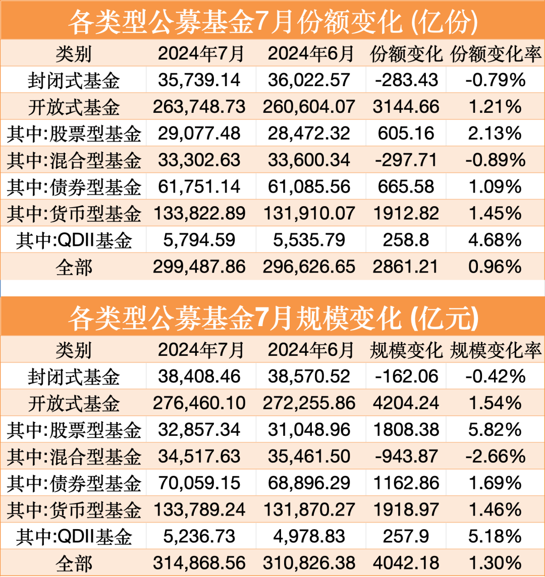相比之下,7月份封闭基金和混合基金规模小幅缩水,环比分别下降0.42%。、2.66%。