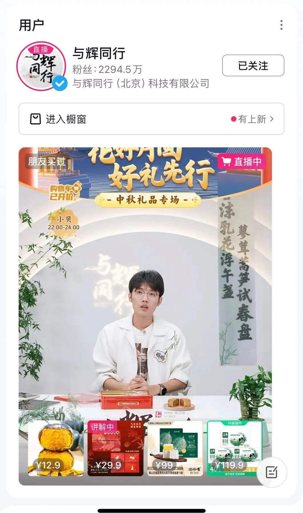 今晚与辉同行的直播间正在进行中秋礼品的特别节目,但董宇辉并没有出现在直播中,但带货榜依然排名第七,该账号的粉丝数量也达到了2294.5万,依然位于抖音头部账号队。