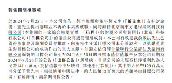董事会主席俞敏洪随后多次回应,与辉同行的净利润全部奖励董宇辉。在当时的公告中,东方选举表示,除了向董宇辉支付所有承诺的福利和补偿外,俞敏洪已经向股东大会寻求许可,并向董宇辉分配了所有与辉同行的未分配利润,作为对董宇辉贡献的感谢和赞扬。另外,为了维持与辉同行的正常运作,公司将免费为与辉同行提供自主研发信息系统。根据当时的公告,从2023年12月22日到2024年6月30日,与辉同行实现了未经批准的税前溢利约1.89亿元;净利润约1.41亿元。
