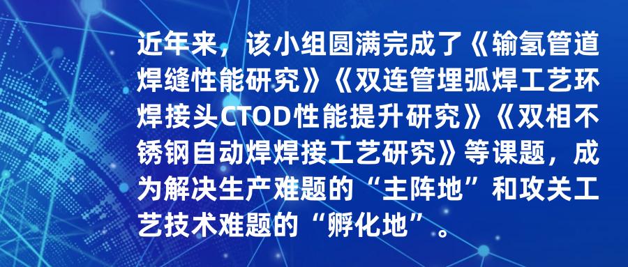 同时,小组还进行了合作共研,取得了一系列可喜的成绩。比如与管道局科技信息中心、研究院、管道公司、华油工程建设公司等单位合作,完成中型薄壁管道全自动焊接技术设备的研发,依托国内中型薄壁管道项目,开发升级全自动焊接相关技术和设备,实现中型薄壁管道“无垫片、零间隙组对”全自动焊接技术建设,填补管道焊接施工领域的空白。