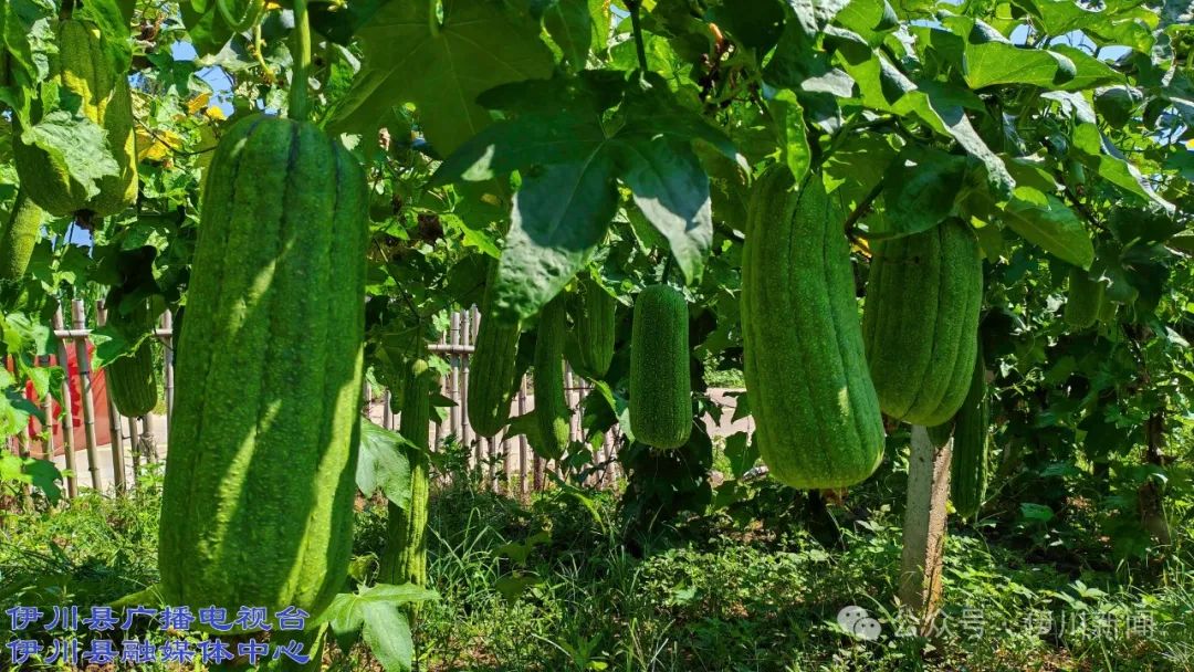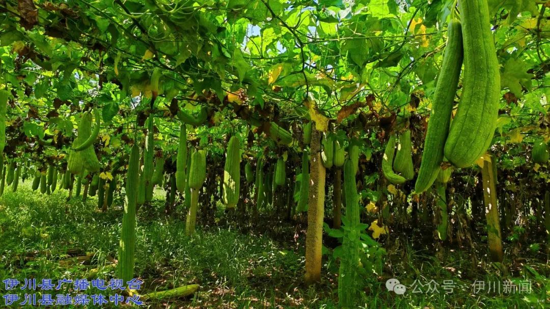 在丝瓜园里,丝瓜藤爬上竹架向四周扩散。藤蔓上的黄花非常醒目。绿色的黄瓜从树枝上垂下来,又高又饱满。村民们忙于修剪和采摘,脸上充满了丰收的喜悦。