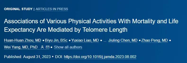 ⑧Associations of Various Physical Activities with Mortality and Life Expectancy are Mediated by Telomere Length. J Am Med Dir Assoc. 2023 Sep 1.https://doi.org/10.1016/j.jamda.2023.08.002