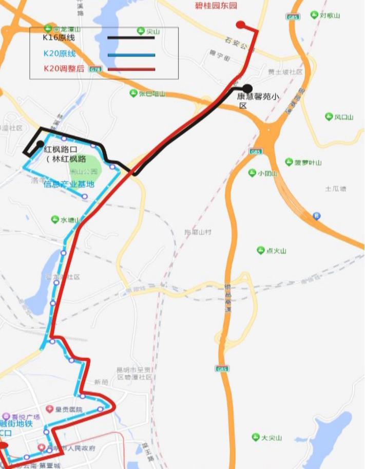 K20路调整后,网站为“碧桂园东园(起始站))、昆明科技城(石龙路)沪滇临港、锦宁路口(石龙路)、金线东口(去)、金线路口(石龙路)、王家营(石龙路)、大梨园路口(石龙路)、小梨园路口(金山路)(回)、龙湖路口(小梨园路)、大梨园路口(小梨园路)、石龙路口(大梨园路)、小新册村口,小编村,大新册村(回)、白龙潭紫檀苑(去)、昆百大新都会(祥和街)(回)、昆百大新都会(春融街)、景明北路口(春融街)(回)、昆三中(春融街)(回)、昆三中(春融东路)、市委(朝云街)(去)、市政(朝云街)(去)、新区会堂(春融街)(回)、云南路口(春融街)(回)、春融街地铁站C口2(终到站)”。