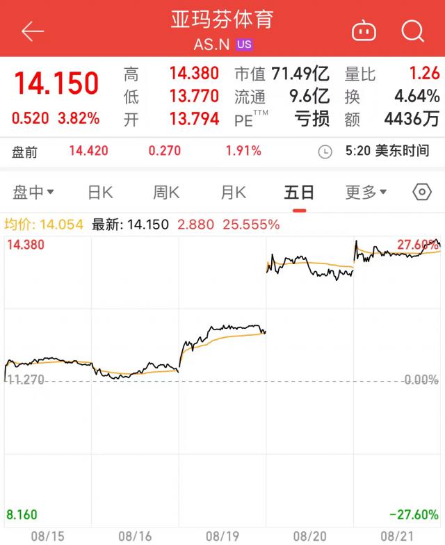 受业绩推动影响,亚玛芬体育美股股价在财务报告发布当天单日涨幅超过。 近两天股价累计上涨10%。 18.94%,截至 8 月 22 每天收盘,报收 14.15 美金 / 股票、企业总市值回升至股票 71.49 亿美金。