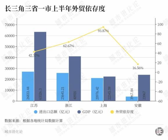从长三角的角度来看,对外贸易对经济的贡献确实是安徽需要加速弥补的一个缺点。上半年,长三角三省一市的对外贸易依赖度约为51.42%,而安徽仅为16.56%,仍有较大的增长空间。如果2027年进出口总额达到1.2万亿元,对外贸易依赖预期将达到17.14%,增长0.62%%。