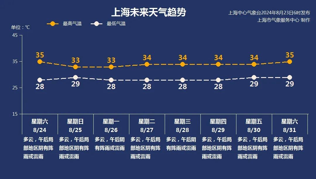 八月二十四日(星期六):阴天,下午局部阴雨或雷雨,28~35℃