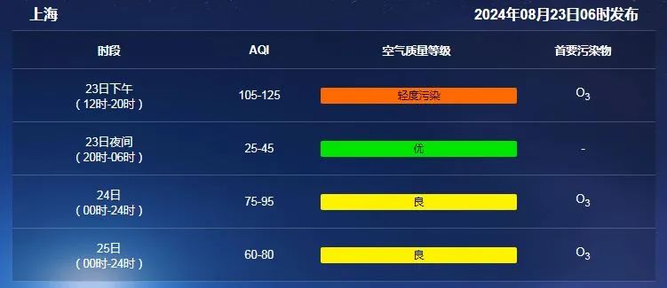 今天(8月23日)上海多云晴天,下午到晚上部分地区有阵雨或雷雨。气温比昨天高。徐家汇站早上气温起步在29℃左右,风速不大,南至东南风3。~四级,相对湿度90%~50%,请继续做好防暑降温工作。