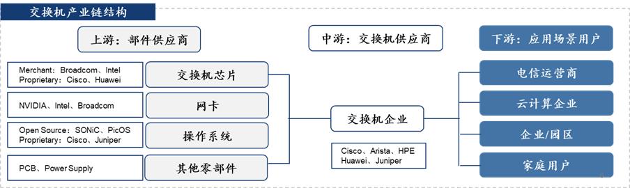 交换机、交换芯片和网卡是构建以太网基础设施的核心部件。其中,交换机是当代网络&数据中心基础设施的核心部件,集成了每一个核心硬件和软件操作系统,负责网络中数据的传输和路由。世界主要供应商包括思科。Arista、华为等。作为交换机的核心部件,交换芯片决定了交换机的端口速度和吞吐量,技术门槛高。全球核心制造商包括英特尔、博通和Marvell。网卡利用其物理接口与交换机连接,实现计算机与网络物理层的连接,决定了数据的传输和卸载速度。世界核心供应商主要集中在互联网上。、英伟达和博通等等。