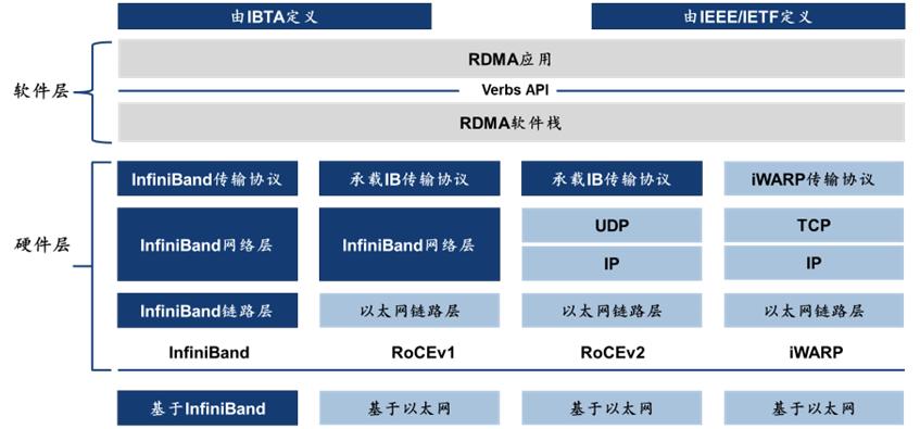 现在主流RDMA方案有三种,层次结构和网络硬件配置各不相同: