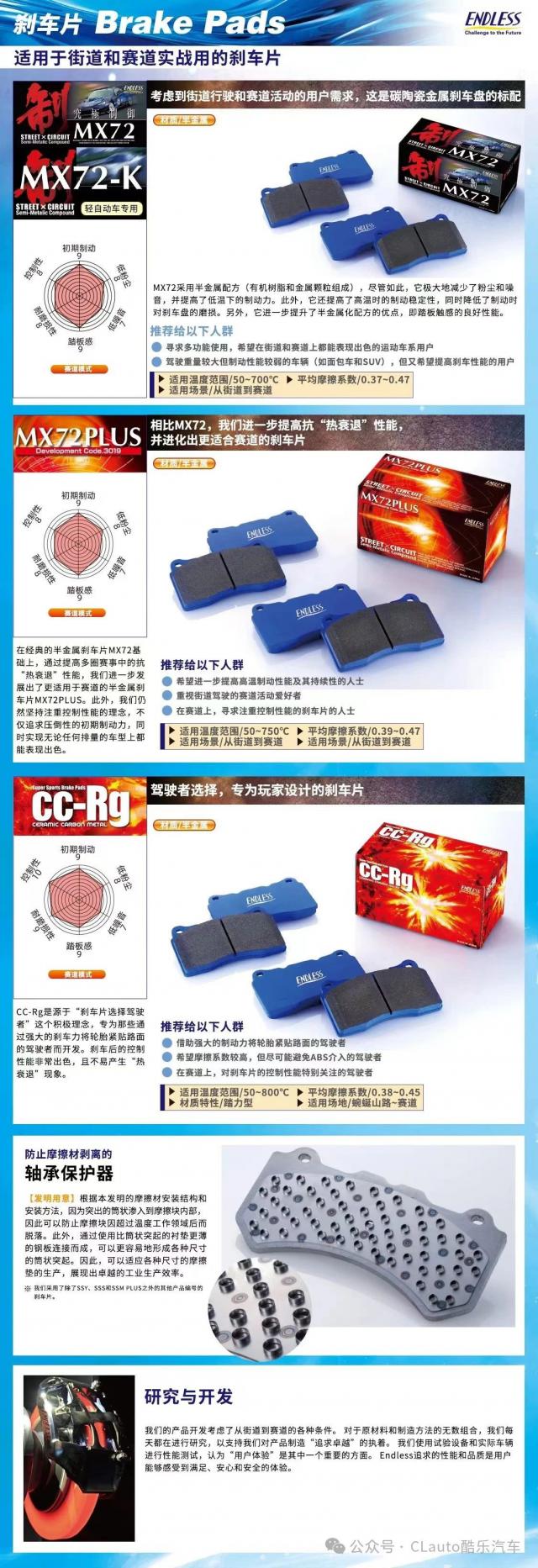 特别是 ENDLESS 独创的 E 字碟,不但制动效果更好,而且还可以提醒刹车盘何时更换。