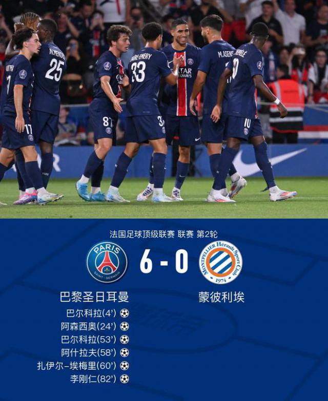 巴黎6-0击败蒙彼利埃,巴尔科拉双响,阿森西奥,李刚仁破门而入。