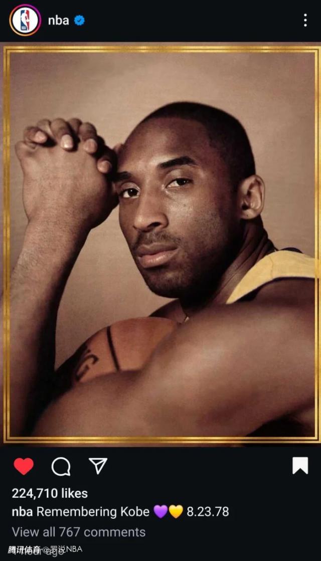 NBA 官方媒体还在生日那天向科比致敬,他们贴出了科比的特写,并配文:“缅怀科比(紫金爱心)8.23.78。”