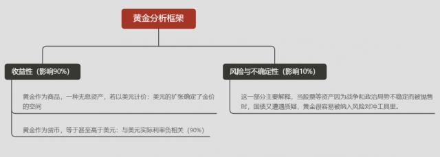 对于分析金价涨跌的美元指数、美国国债、通货膨胀和战争,本质上也是从收益性和不确定性两个角度来分析的,但核心缺乏明确的收益率比较,不够清晰。