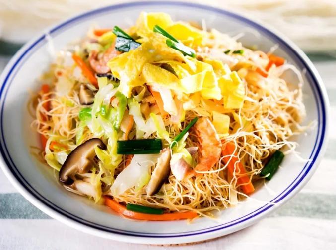 大米制成的面条在江南地区被称为米粉,在北方被称为米粉。虽然都是大米加工而成,但是江南米粉比米粉更准确,而且干硬,储存时间长。炒饭面是台州最传统的吃法。首先用开水烫软米面,加入适量的油和生抽搅拌均匀。将鸡蛋放入热油锅中备用,将猪肉丝翻炒,倒入米粉中,不断翻炒,然后加入鸡蛋、虾干、绿豆芽、洋葱等喜欢的食材,将米粉翻炒至疏松,酱色均匀,加入葱花即可出锅,丰富多彩。